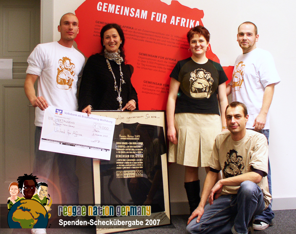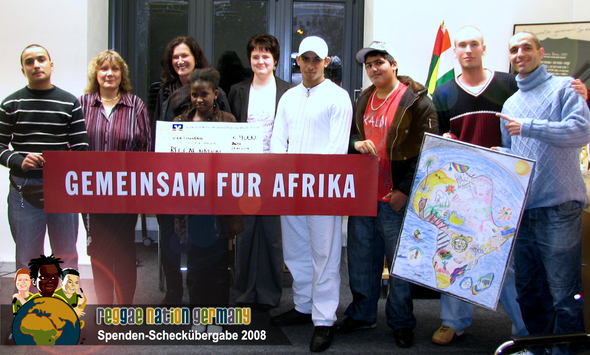 Bereits zum dritten Mal haben die Künstler und Organisatoren des Jugendprojekts REGGAE NATION GERMANY einen Projekttag zugunsten der Kampagne GEMEINSAM FÜR AFRIKA ausgerichtet. Künstler wie die Profetas aus Kolumbien, Shocking Murray, Singing U und King Ali Baba aus Jamaika, oder auch Sänger Charly B und Henry Poupa aus dem Senegal trommelten für den afrikanischen Kontinent. Viele weitere Künstler wie die Soultecniques, Mighty Tolga, Dopewalka, Filip G & Respecta, Sista Lydia, Benjie, Callya, Ras Donovan & Dub Passport sorgten am 2. August 2008 im Braunschweiger Kennel Bad einen ganzen Tag lang für eine gigantische Stimmung. Ihr gemeinsames Anliegen kam dabei nicht zu kurz: Künstler und Organisatoren riefen dazu auf, Solidarität mit den Menschen in Afrika zu beweisen und die Arbeit der Hilfsorganisationen von GEMEISNAM FÜR AFRIKA zu unterstützen. Im Beisein junger Künstler und Unterstützer übergaben die Mitglieder des Projekts REGGAE NATION GERMANY Steven Tümler, Siamak Sharafi und Bianca Buch - einen Scheck über 4.000 Euro an Susanne Anger, die Sprecherin des Bündnisses GEMEINSAM FÜR AFRIKA. "Mit dem Erlös aus dem Verkauf der Konzerttickets unterstützt die Reggae-Gemeinde die wichtige Projektarbeit der Hilfsorganisationen von GEMEINSAM FÜR AFRIKA vor Ort", so die Initiatoren.