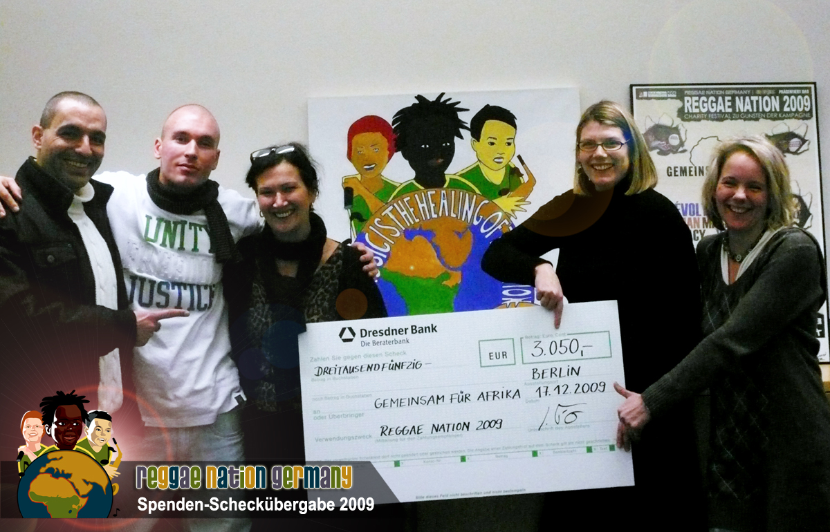 Am 5. Dezember 2009 veranstaltete das Jugendprojekt REGGAE NATION GERMANY unter dem Motto "Jugend in Aktion" erneut einen Projekttag ganz im Zeichen des Charity-Gedankens. Die unterstützenden Künstler - u.a. Irie Révoltés, Tamika & Mamadee, Sista Gracy, Ganjaman, Manja und viele mehr - präsentierten Reggae, HipHop, Dancehall, afrikanische Rhythmen und Soul vom Feinsten. Darüber hinaus wurde eine Anzahl von Workshops angeboten, die sich mit dem Thema Afrika auseinandersetzten und Kinder sowie Jugendliche inspirierten, sich mit dem Kontinent zu befassen. Tatkräftig unterstützt wurde das Projekt erneut von der IG METALL, sowie von unzähligen großartigen Aktivisten. Das Jugendprojekt spendete den gesamten Erlös aus dem Konzert, das im Wolfsburger Kulturzentrum Hallenbad stattfand, an die Kampagne GEMEINSAM FÜR AFRIKA e.V. sowie an die Trinkwasserinitiative VIVA CON AGUA de Sankt Pauli e.V.. Am 17. Dezember 2009 übergaben die Projektmitglieder Steven Tümler und Siamak Sharafi einen Spendenerlös von 3050 Euro an die Kampagne GEMEINSAM FÜR AFRIKA. Wenige Wochen später, am Donnerstag den 25. Februar 2010, übergab Jan Gustenberg im Namen von REGGAE NATION GERMANY einen Spendenscheck in Höhe von 500 Euro an die Trinkwasserinitiative VIVA CON AGUA und ihren Projektgründer Benjamin Adrion.